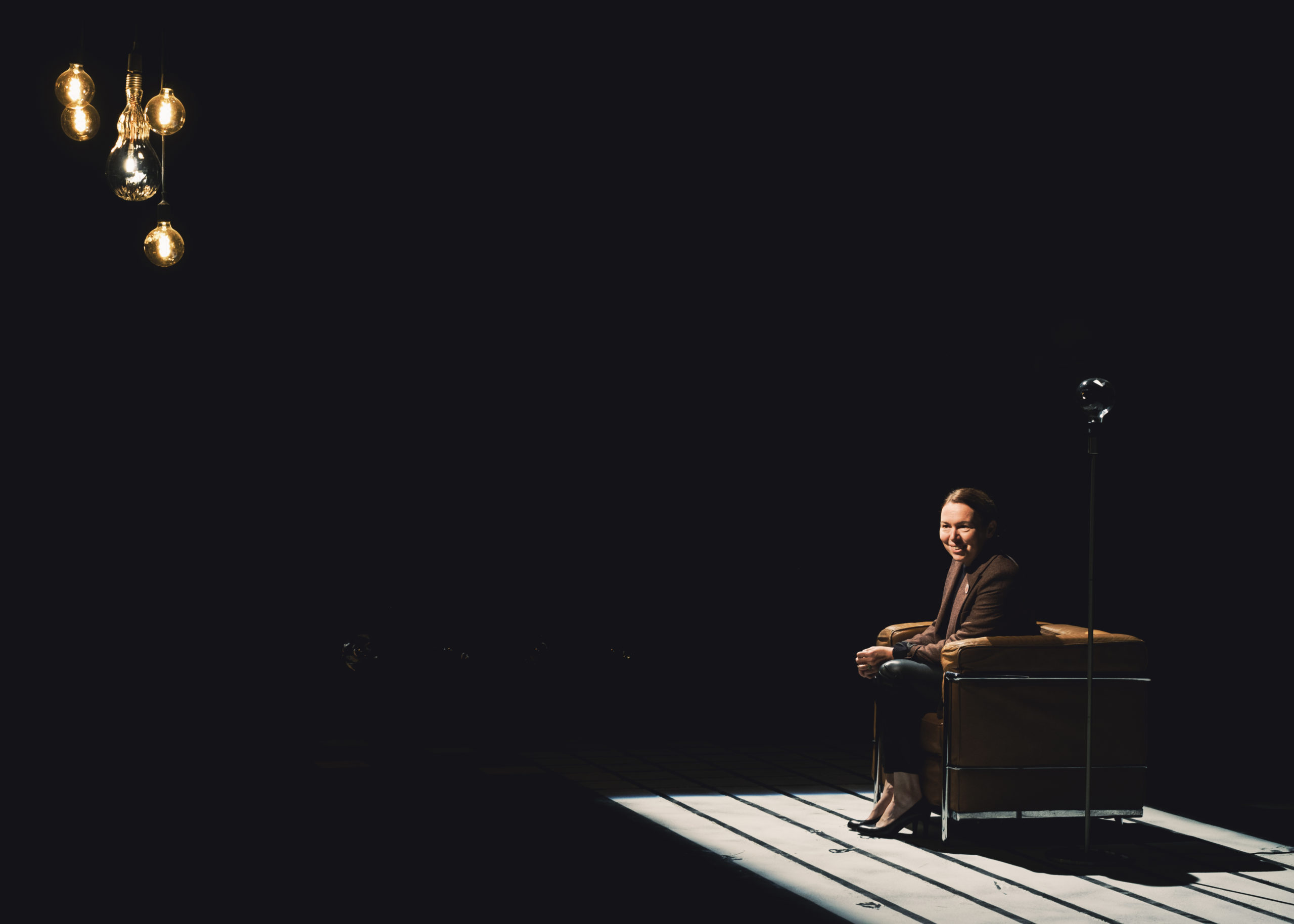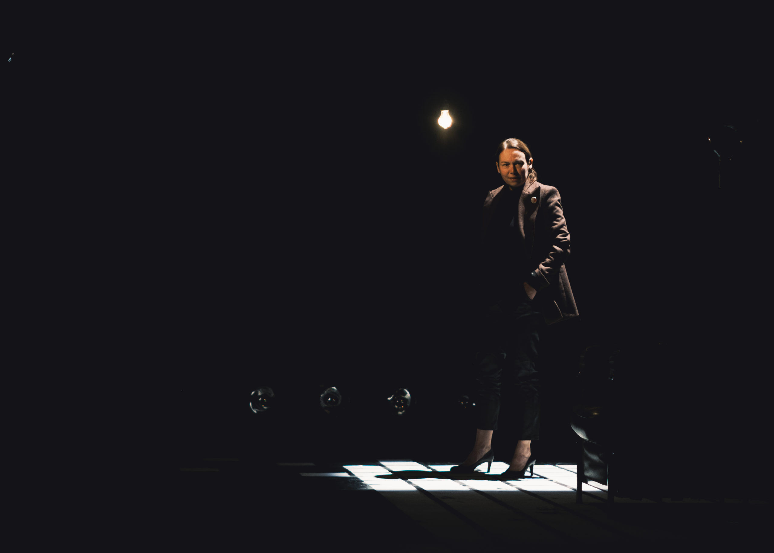 J’aime c’est l’histoire d’une femme qui révèle qui elle aime pour apprivoiser qui elle est, sa multiplicité, et y trouver sa force. Elle entre dans un espace où la parole peut se déployer. Un cabinet, une pièce à l’écart, là où le dire n’est pas contraint mais attendu et espéré, là où le dire travaille l’être. Sur la scène, peu d’éléments pour une infinité de combinaisons : ampoules soufflées, guindes, poulies, sol apparemment tangible alors qu’il n’est que de farine…